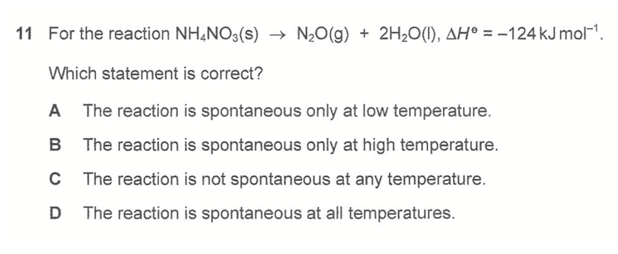 When ΔH is negative and (-TΔS) term is negative, we can deduce Gibbs free energy is always negative and reaction is always feasible or spontaneous.